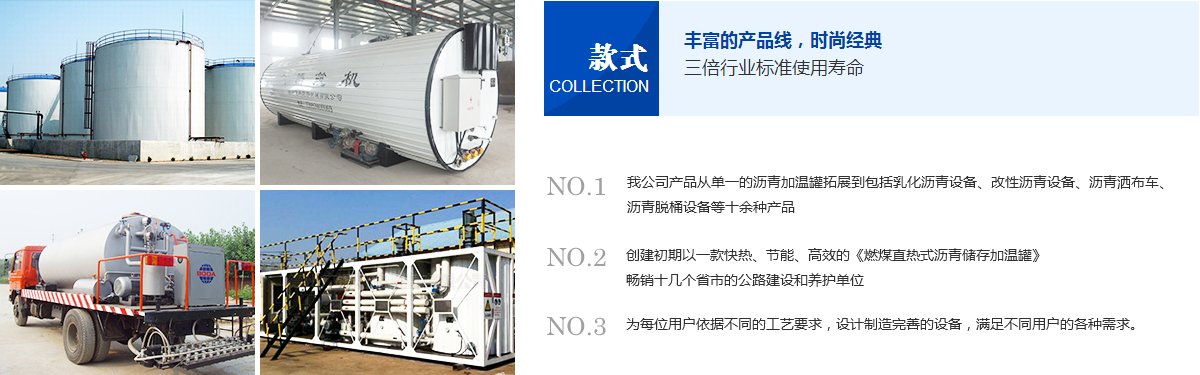 目前我公司產(chǎn)品從單一的瀝青加溫罐拓展到包括乳化瀝青設(shè)備、改性瀝青設(shè)備、瀝青灑布車、瀝青脫桶設(shè)備等十余種產(chǎn)品。